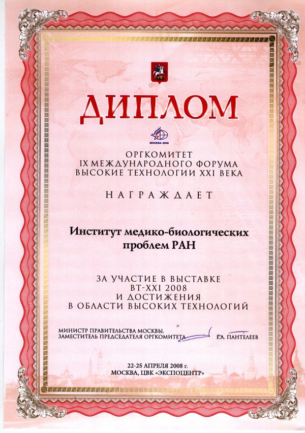 На коллективном стенде Российской академии наук были представлены разработки Института: лечебный костюм "Регент", компенсатор опорной разгрузки "Корвит", иммерсионный комплекс, способ и система для тренировки мышц с изменением нагрузки во время выполнения движения, приборы "Сонокард" и "Пневмокард". Экспозиция Института привлекла большое внимание со стороны российских и зарубежных посетителей, прессы. Разработки представляли сотрудники Института: Сахарова А.Б., Иванов О.Г., Ешманова А. Институту вручен Диплом.