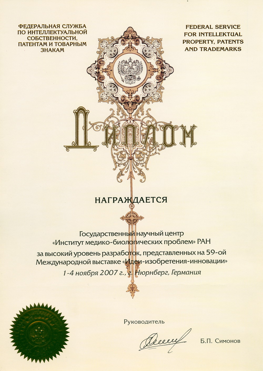 Кроме того, Институт награжден Дипломом Федеральной службы по интеллектуальной собственности, патентам и товарным знакам за высокий уровень разработок, представленных на 59-й Международной выставке "Идеи - изобретения - инновации".