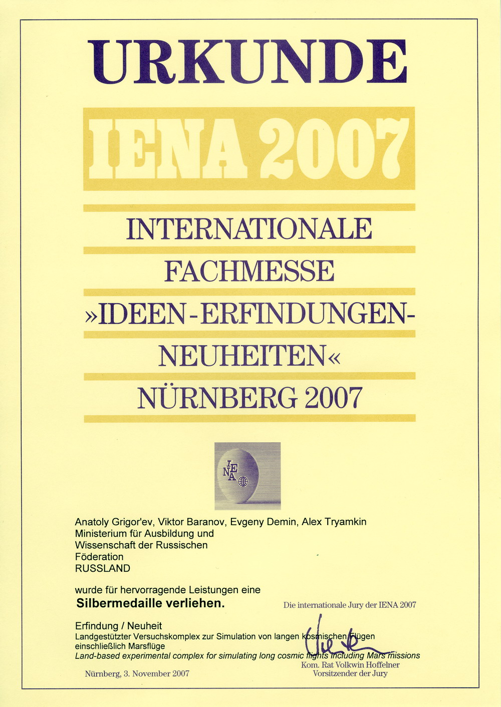 - "Наземный экспериментальный комплекс для моделирования длительных космических полетов, в том числе на Марс". Авторы: Григорьев А.И., Баранов В.М., Демин Е.П., Трямкин А.В.